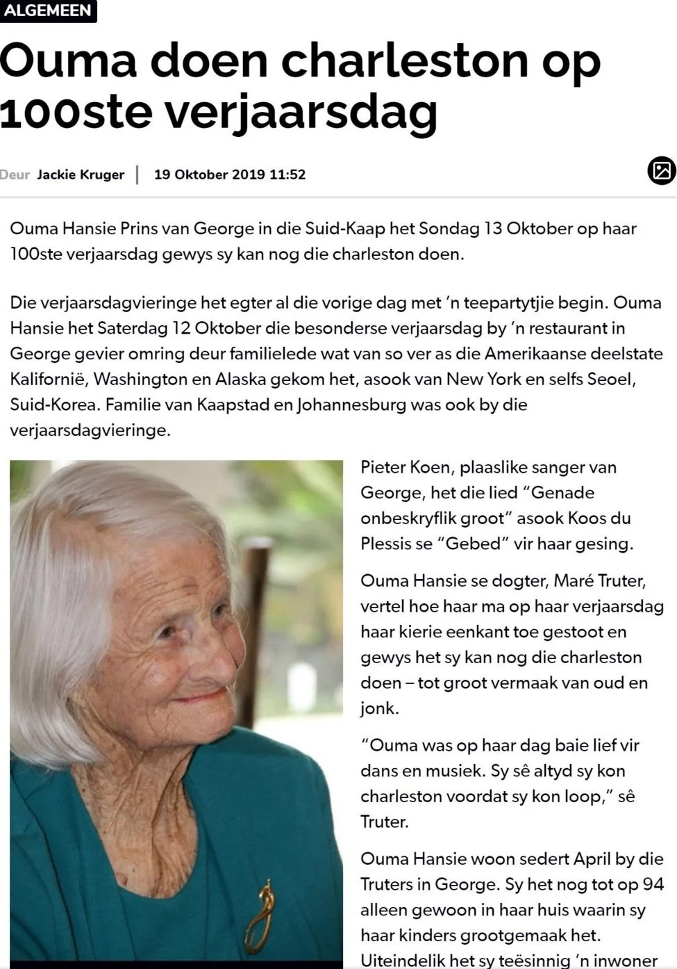 Kruger, Jackie. “Ouma Doen Charleston Op 100ste Verjaarsdag.” Netwerk24. Last modified October 19, 2019. Accessed October 6, 2020. https://www.netwerk24.com/Nuus/Algemeen/ouma-doen-charleston-op-100ste-verjaarsdag-20191018.