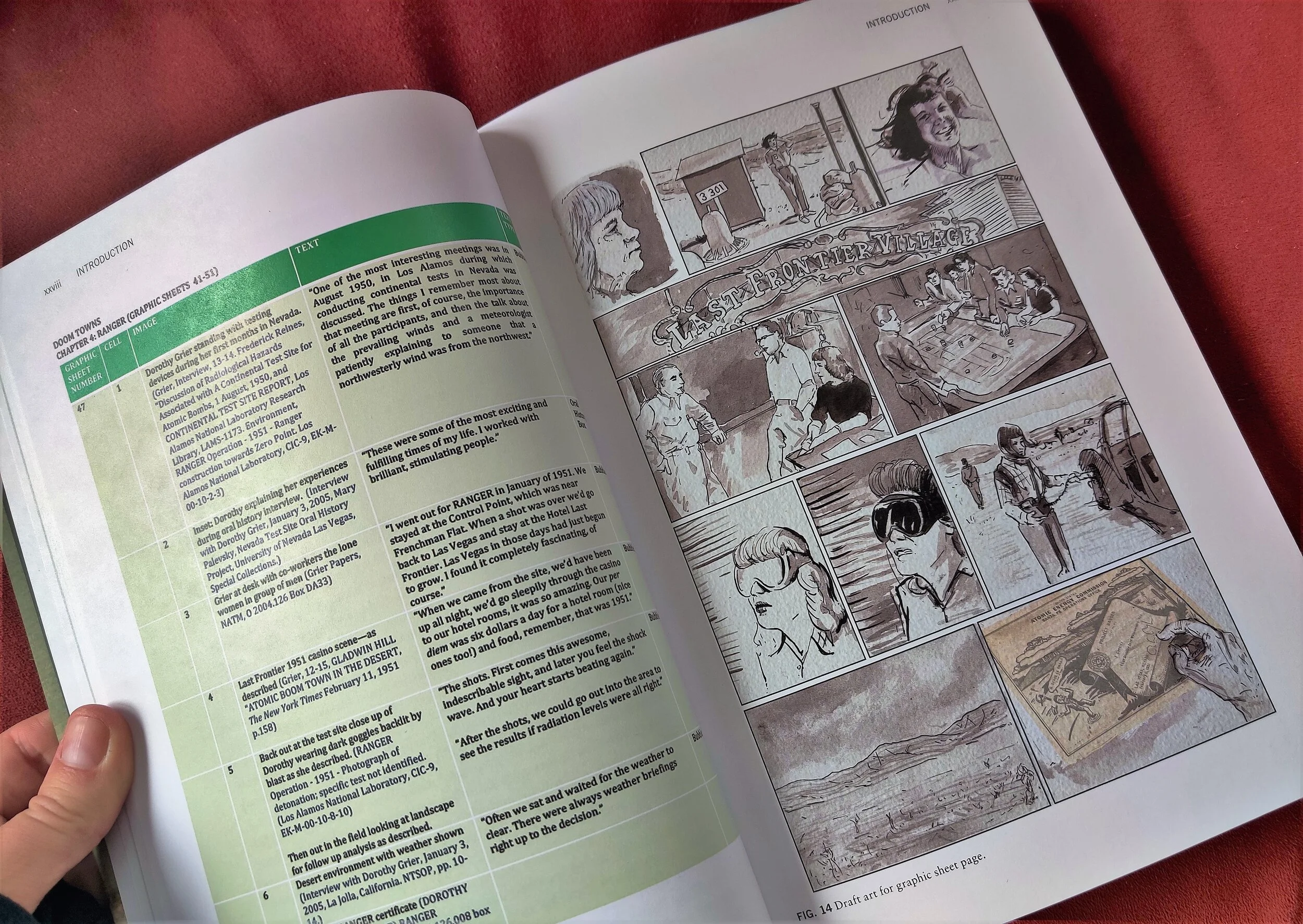 Using spreadsheets, he mapped out each panel’s image references and text for illustrator Kristian Purcell so that he could understand both the facts and the story arc for that section. He wrote a scholarly introduction detailing his methodology and provided so many notes, and primary source transcripts and images, that it provides a super-clear road map for planning my own work. As can be seen on the page above, there may be a tradeoff between creating evocative visuals and staying true to existing historical images. Even though Doom Towns is much less technical and more reliant on personal oral histories than Trinity, I found it lacking in momentum and a bit harder to follow than the other graphic histories I’ve read. This intersection of an emerging academic genre with a pretty new popular genre has lots of potential for improvement—and despite that I don’t love his final product, Kirk provides a helpful roadmap to those hoping to follow in his footsteps.